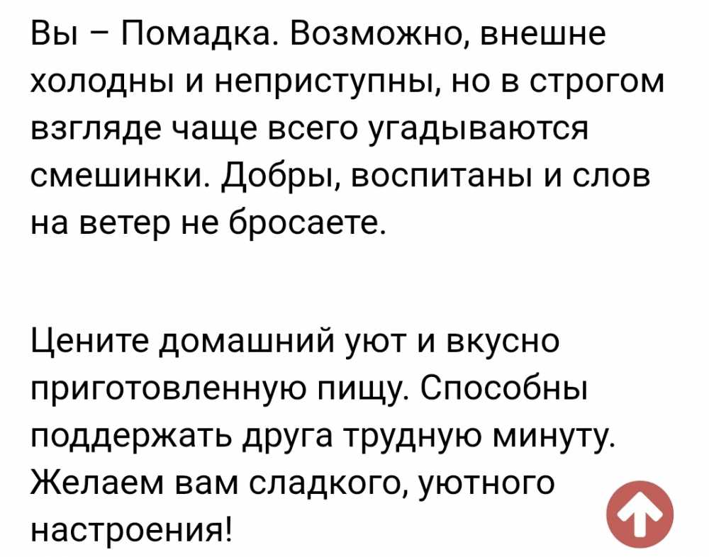 Маркиза Карабас 103896 Posted September 16 Не щитово! Я старалась, выбирала коньяк во всех вопросах. А я...Леденец? Обидна. Вы - Леденец. Вероятно, обладаете твердым характером и отменной силой воли. Вас не так-то просто раскусить, но в общении предпочтете прозрачность и честность. А вот в окружении дорогих вам людей вы начинаете медленно таять, словно снег под лучами весеннего солнца. Желаем вам сладкого, уютного настроения! Вы - Леденец. Вероятно, обладаете твердым характером и отменной силой воли. Вас не так-то просто раскусить, но в общении предпочтете прозрачность и честность. Леденец. Вероятно, обладаете твердым характером и отменной силой воли. Вас не так-то просто раскусить, но в общении предпочтете прозрачность и честность. 1 Share this post Link to post Share on other sites OK В